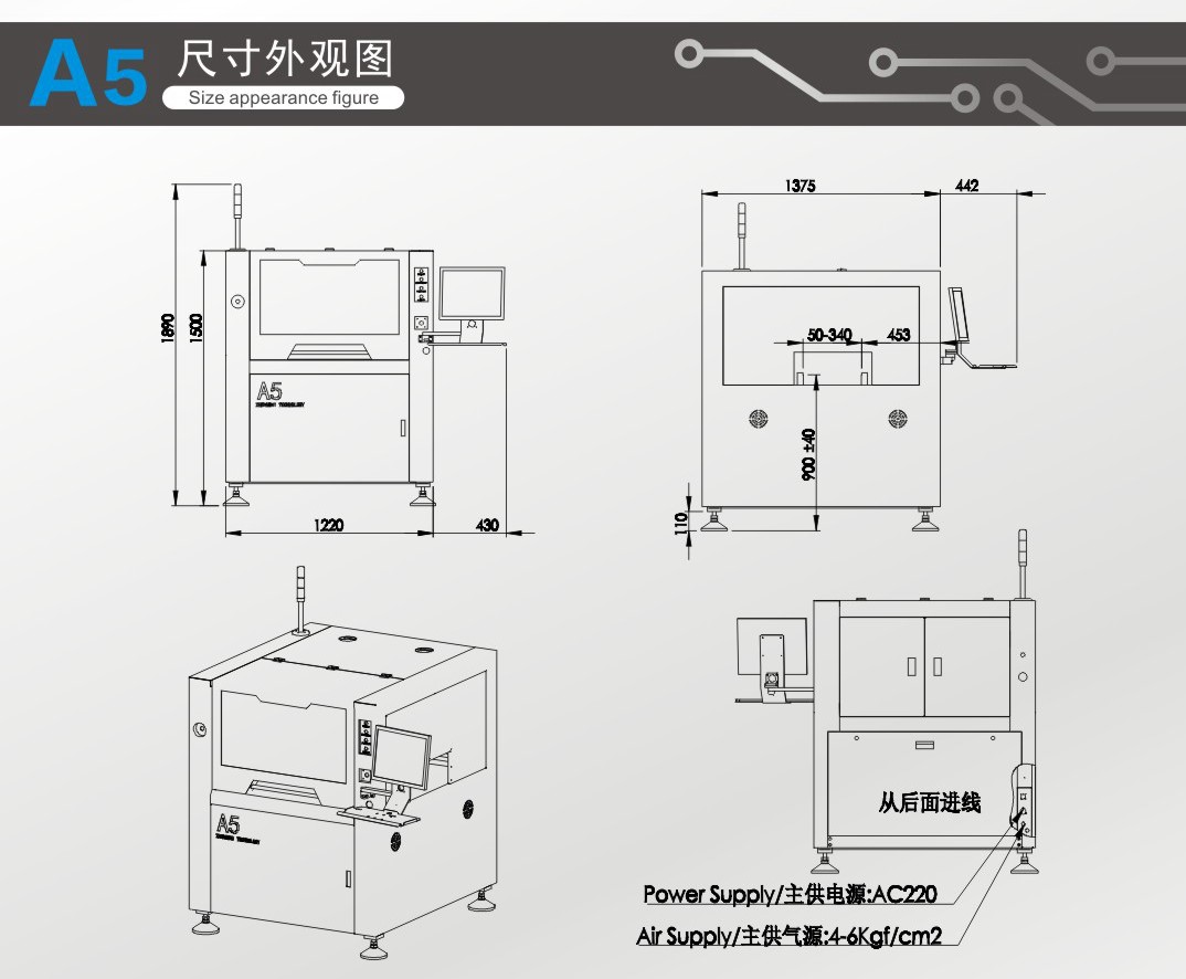 A5系列是一款高精度全自動錫膏印刷機(High?PrecisionAuto?Paste?Printer)。在表面組裝工藝生產(SMT)中,用于高精度的鋼網印刷或漏版印刷的專用生產設備。