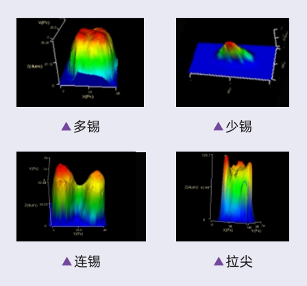 可對錫膏“拉尖”進行有效檢測。 采用最大截面包圍的算法,能有效檢出斷錫不良。