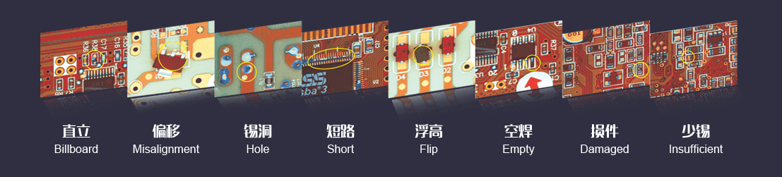 | 檢測(cè)覆蓋類型 | 偏移、少錫、短路、污染、缺件、歪斜、立碑、側(cè)立、翻件、錯(cuò)件、破損、浮高、極性、虛焊、 空焊、溢膠、錫洞、引腳未出等  |